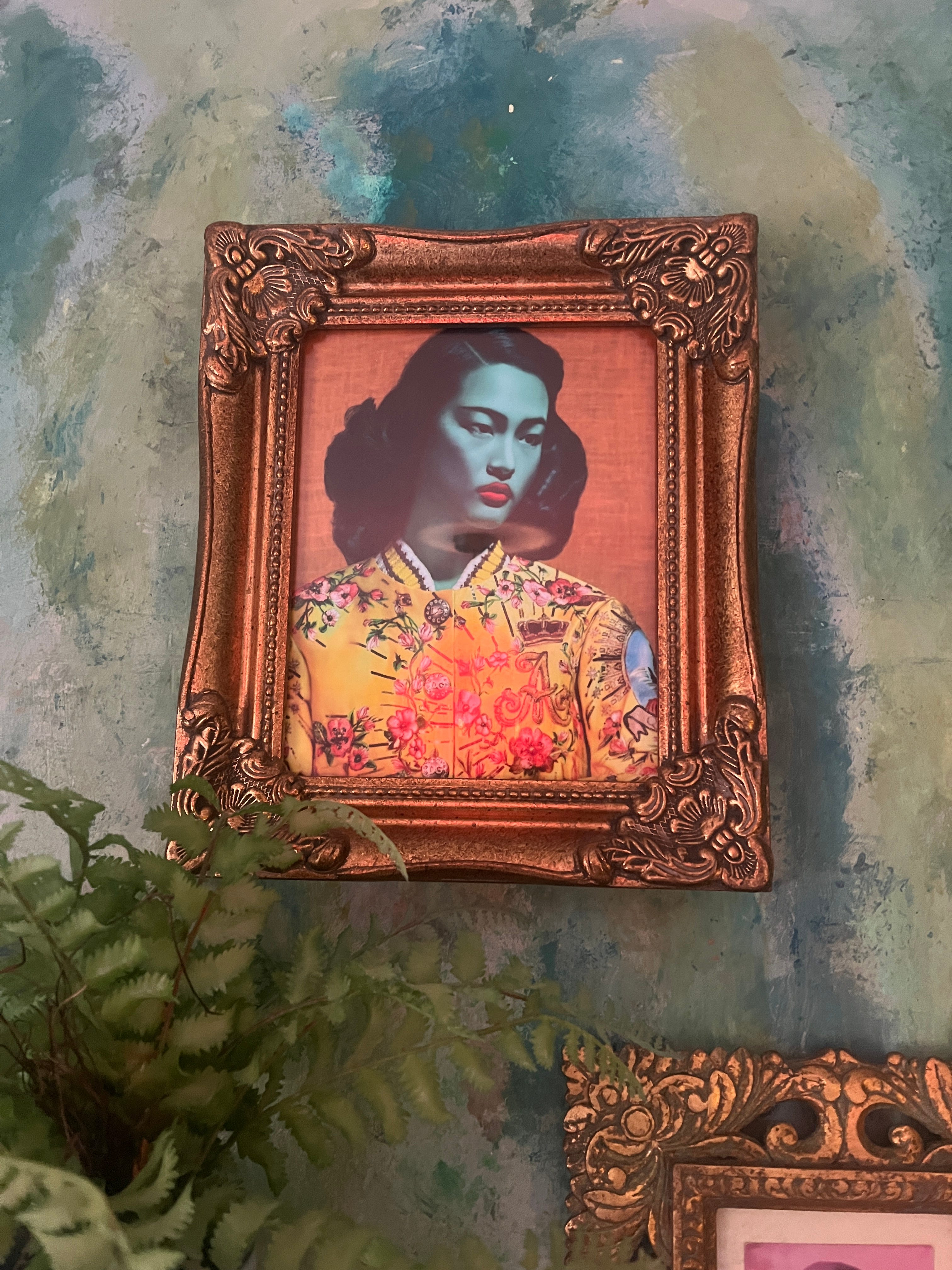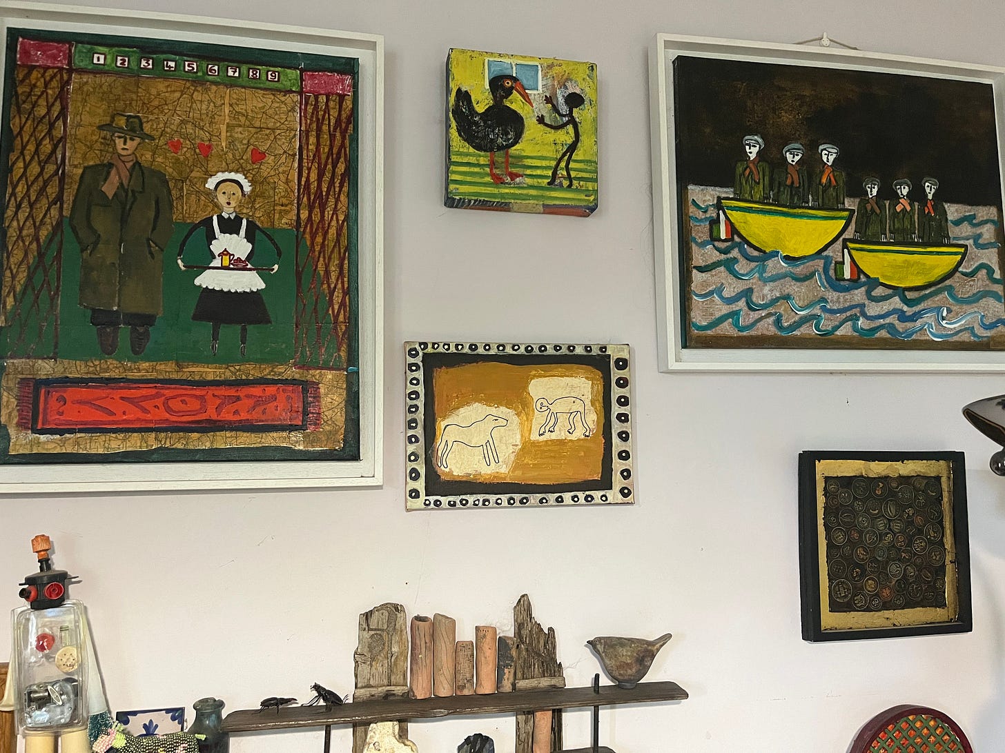 All the walls in Trish’s home are covered in artwork, the collection being a mix of her own pieces and other peoples. Two of her wonderful pieces here tell a story of her grandad, traveling over to England from Ireland and meeting his future wife.